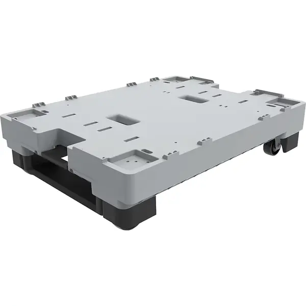 Palette à 2 entrées en plastique PP résistant avec 2 semelles et 4 roulettes. Convient pour passage sur les véhicules à guidage automatique.