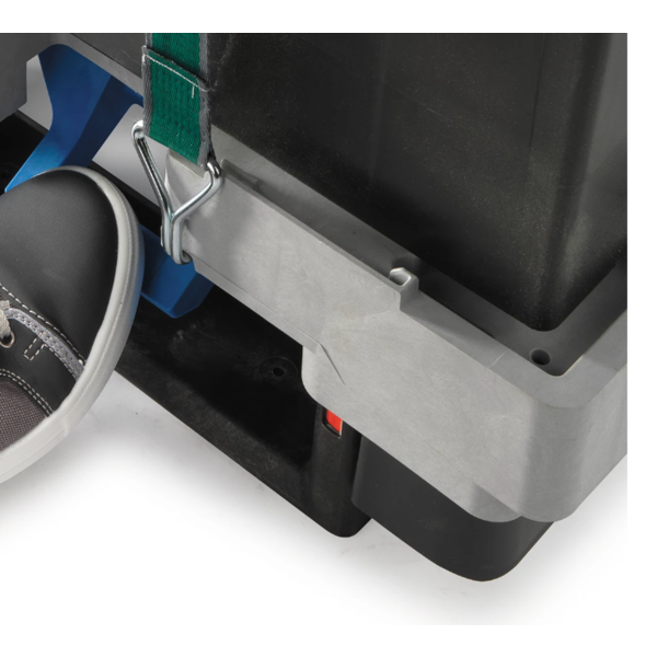 Au moyen d'une pédale, la simple palette en plastique se transforme en plateau roulant et vice versa. Il vous suffit simplement d'appuyer sur la pédale pour faire apparaître ou disparaître 4 roues.