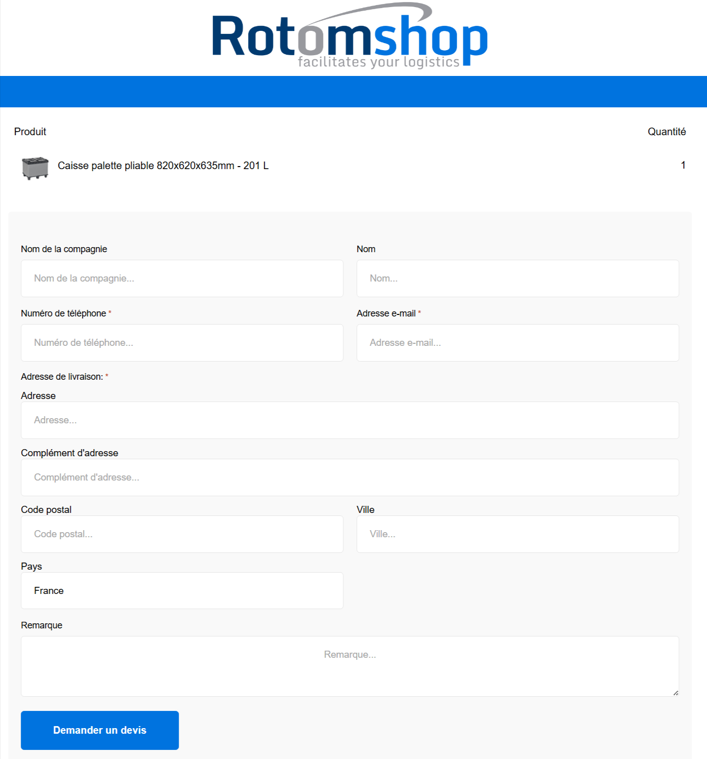 Complétez le formulaire de demande de devis, en précisant pour quelles quantités. Vérifiez votre saisie (produits concernés, et quantités) puis cliquez sur le bouton bleu Demander un devis situé en bas à gauche de votre écran.