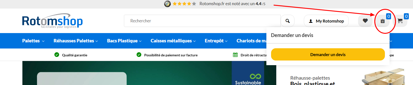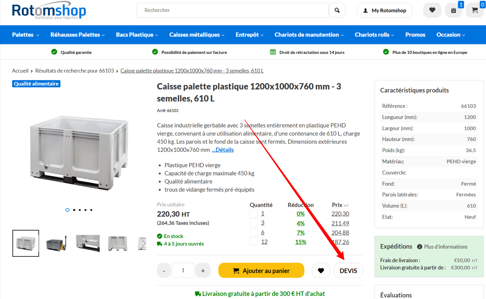 Sur chacune de nos fiches produits se trouve un bouton DEVIS, sur la droite du bouton jaune Ajouter au panier